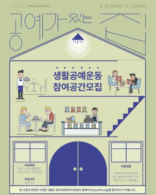 모집 대상은 청주시 소재 카페, 식당, 사무실 등 생활공간 6개소로, 최종 선정된 공간에는 지역 공예가와의 1대 1 매칭을 통해 공간의 특성과 이용자 성격을 반영한 공예적 공간 디자인이 지원된다. 이후 전문가 컨설팅을 거쳐 완성도를 높이고, 공예 작품 설치 및 공간 연출까지 단계적으로 추진할 예정이다.