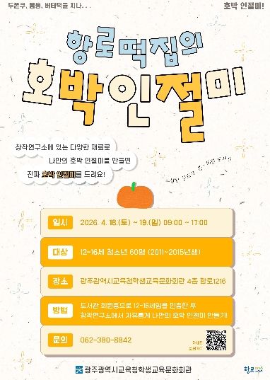 한방통신사 김성의 기자 | 광주시교육청학생교육문화회관은 오는 18~19일 회관 내 청소년 전용 공간 ‘항로1216’에서 ‘호박 인절미 창작 챌린지’를 운영한다.