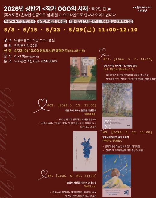 한방통신사 신유철기자 기자 | 의정부시는 2026년 상반기 ‘작가 OOO의 서재: 백수린 편’을 5월 매주 금요일(8일, 15일, 22일, 29일) 총 4회에 걸쳐 의정부정보도서관에서 운영한다.