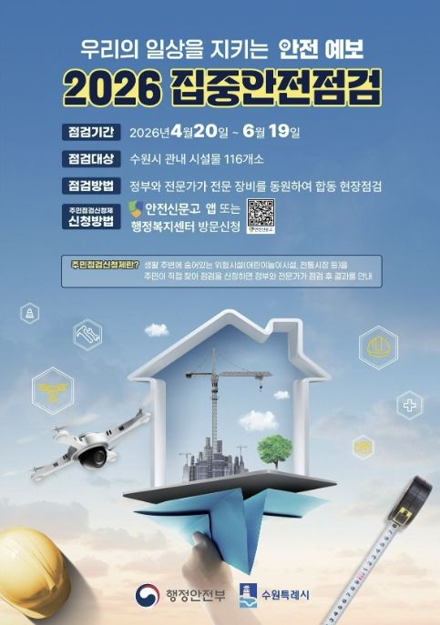 한방통신사 신유철기자 기자 | 수원특례시가 안전사고를 예방하고, 시민의 안전 의식을 고취하기 위해 20일부터 6월 19일까지 ‘2026년 집중안전점검’을 한다.