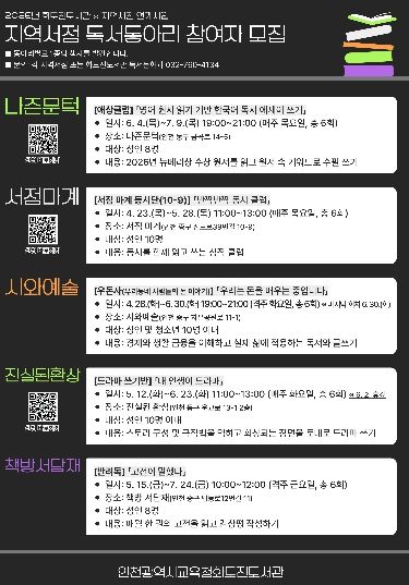 한방통신사 신유철기자 기자 | 인천광역시교육청화도진도서관은 지역 독서 문화 활성화를 위해 ‘지역서점 연계 독서동아리’ 참여자를 모집한다고 20일 밝혔다.