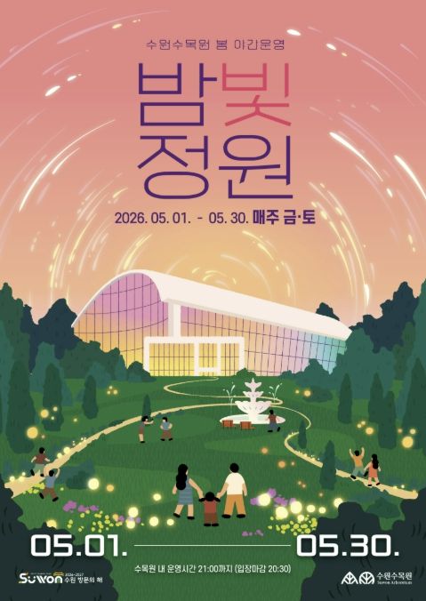 한방통신사 신유철기자 기자 | 수원특례시가 5월 1일부터 30일까지 매주 금·토요일 일월·영흥수목원에서 ‘2026년 수원수목원 봄 밤빛정원’을 연다.