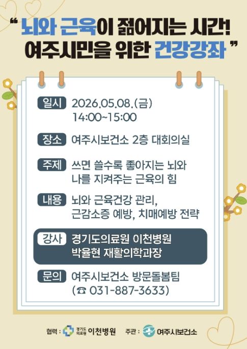 한방통신사 신유철기자 기자 | 여주시보건소 건강증진과는 오는 5월 8일 오후 2시, 보건소 2층 대회의실에서 여주시민을 위한 건강강좌 '뇌와 근육이 젊어지는 시간!'을 개최한다고 밝혔다.