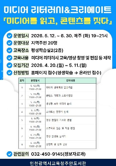 한방통신사 신유철기자 기자 | 인천광역시교육청주안도서관은 시민의 디지털 역량 강화와 올바른 미디어 활용을 돕기 위해, 5월 12일부터 미디어 리터러시 교육 프로그램 ‘미디어를 읽고, 콘텐츠를 짓다’를 운영한다.