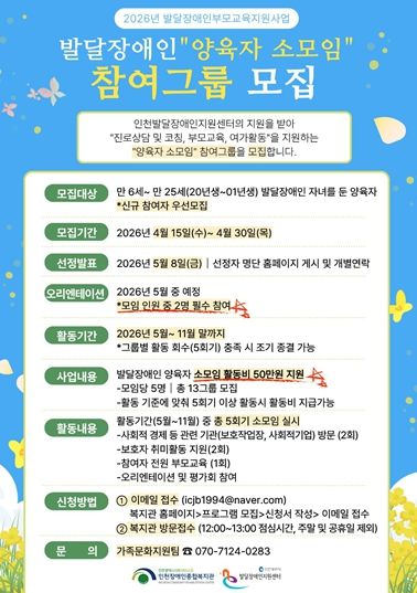 한방통신사 신유철기자 기자 | 인천시사회서비스원 소속 인천장애인종합복지관은 ‘발달장애인 양육자 소모임’ 참여자를 모집한다고 21일 밝혔다.