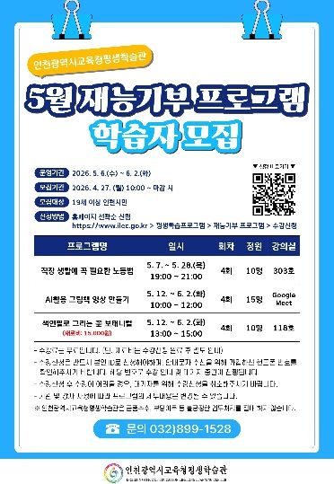 5월에는 ▲직장 생활에 꼭 필요한 노동법 ▲AI 활용 그림책 영상 만들기 ▲색연필로 그리는 꽃 보태니컬 등 총 3개 강좌가 5월 7일부터 운영된다.