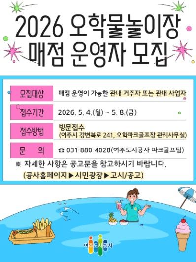 한방통신사 신유철기자 기자 | 여주도시공사는 2026년 오학물놀이장 운영을 앞두고 이용객 편의 제공을 위한 매점 운영자를 공개 모집한다고 밝혔다.