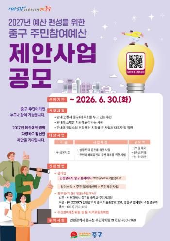 한방통신사 신유철기자 기자 | 인천시 중구는 ‘2027년도 예산편성을 위한 주민참여예산 제안사업 공모’를 추진한다고 23일 밝혔다.