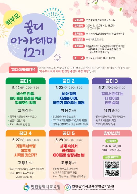 한방통신사 신유철기자 기자 | 인천광역시교육청평생학습관은 23일부터 인천 관내 학부모를 대상으로 ‘2026년 학부모 꿈디 아카데미 12기’ 학습자를 모집한다.