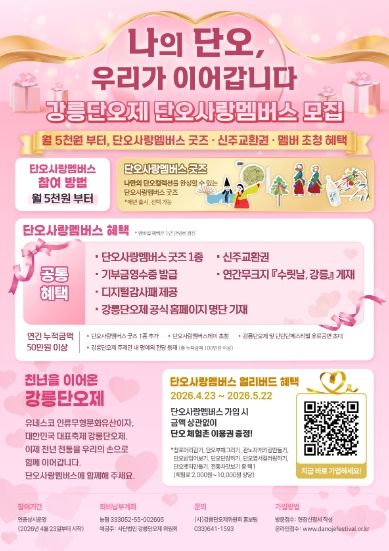 위원회 관계자는 “단오사랑 멤버스는 단순한 후원을 넘어 시민이 직접 축제의 주체가 되어 천년 전통을 이어가는 참여형 프로그램”이라며 “많은 분들의 관심과 참여를 통해 강릉단오제가 더욱 풍성한 축제로 발전하길 기대한다”고 말했다.