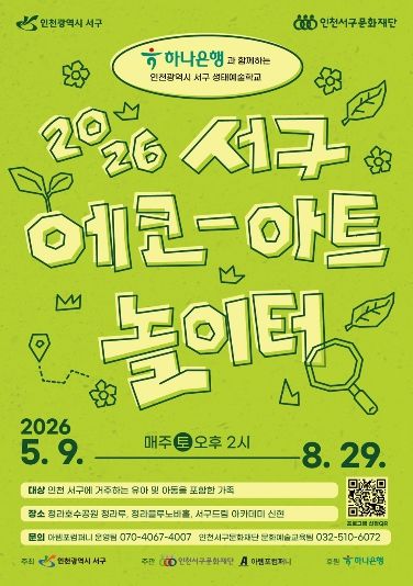 한방통신사 신유철기자 기자 | (재)인천서구문화재단(대표이사 김성하)은 하나은행과 함께하는 2026년 ‘서구 에코-아트놀이터 시즌3’를 운영한다. 이는 도심 속 생태환경을 주제로 한 가족 참여형 문화예술교육 프로그램이다.