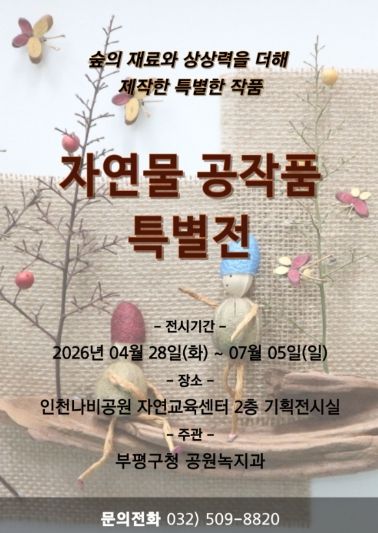 한방통신사 신유철기자 기자 | 부평구는 부평숲 인천나비공원에서 오는 28일부터 ‘자연물 공작품 특별전’을 개최한다고 밝혔다.