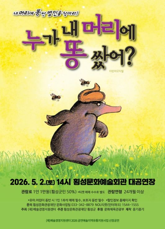 한방통신사 양호선기자 기자 | 횡성문화관광재단은 5월 가정의 달을 맞아 오는 5월 2일 토요일 오후 2시, 인기 그림책을 원작으로 한 어린이뮤지컬 '누가 내 머리에 똥 쌌어' 를 선보인다.