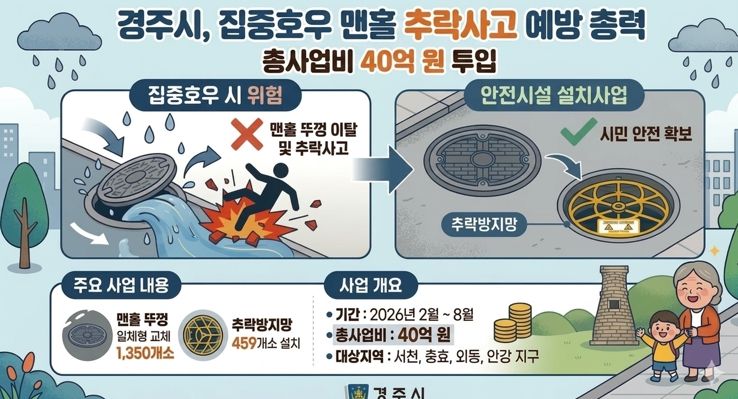 최혁준 경주시장 권한대행은 “집중호우 시 맨홀 이탈로 인한 안전사고 차단이 중요하다”며 “시민 안전 확보를 위한 생활밀착형 안전시설 확충에 최선을 다하겠다”고 말했다.