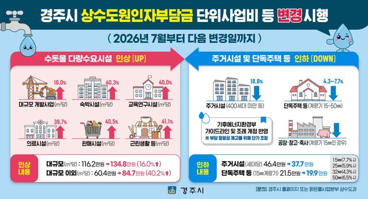 경주시는 이번 조정으로 다량 수요 시설의 부담은 강화하고 일반 가정과 주거시설의 부담은 줄이는 방향으로 제도를 개편했다고 설명했다.