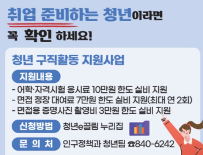 지원 항목은 ▲어학․자격시험 응시료 최대 10만 원 ▲면접 정장 대여료 7만 원(연 2회) ▲면접 증명사진 촬영비 3만 원(연 1회) 등으로, 각 항목별 기준에 따라 실비를 지원한다.