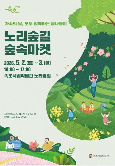 먼저 5월 2일과 3일 이틀간 ‘가족의 달, 모두 함께하는 봄나들이’를 주제로 노리숲길 숲속마켓이 열린다. 속초시민과 가족 단위 관람객의 꾸준한 사랑을 받아온 노리숲길 숲속마켓은 다양한 체험 프로그램과 지역 특산물 판매를 통해 속초의 매력을 느낄 수 있는 행사다.