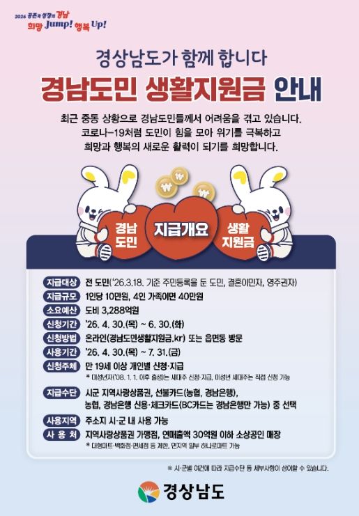 지원 대상은 2026년 3월 18일 기준으로 하동군에 주민등록이 되어 있는 군민이며, 1인당 10만 원씩 지급된다. 이에 따라 4인 가구 기준 최대 40만 원까지 수령할 수 있다.