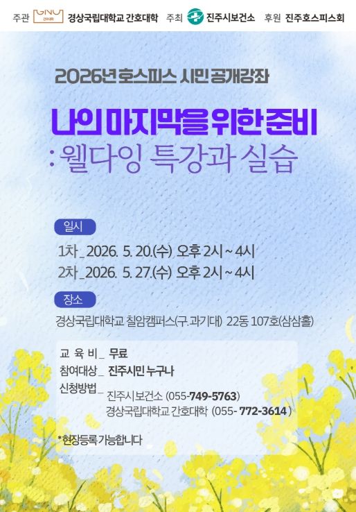 한방통신사 신유철기자 기자 | 진주시와 경상국립대 간호대학은 ‘나의 마지막을 위한 준비’를 주제로 오는 5월 20일과 5월 27일 경상국립대 칠암캠퍼스(옛. 경남과학기술대) 22동 107호(삼삼홀)에서 ‘호스피스 시민 공개강좌’를 실시한다.