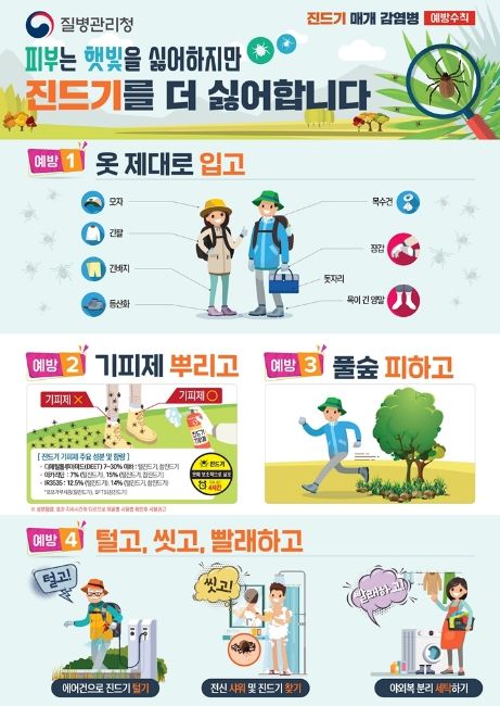 이에 보건소는 ▲야외활동 시 긴팔·긴바지 착용 등 피부 노출 최소화 ▲진드기 기피제 사용 ▲풀밭 접촉 최소화 ▲야생동물과의 접촉 자제 ▲귀가 후 즉시 샤워 및 의복 세탁 ▲진드기 부착 여부 확인 등 예방수칙을 철저히 준수할 것을 당부했다.