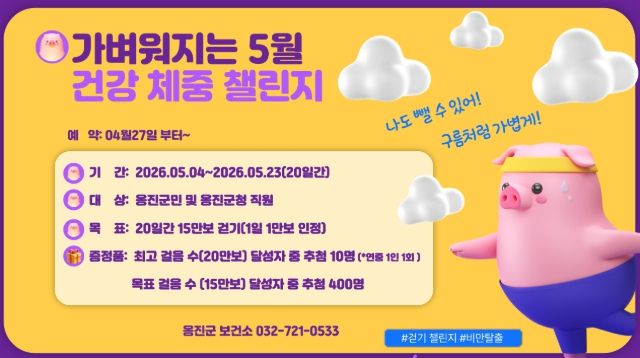 한방통신사 신유철기자 기자 | 옹진군은 군민의 일상 속 걷기 실천을 유도하고 비만 예방 및 건강체중 관리를 지원하기 위해 5월 4일부터 23일까지 20일간 '가벼워지는 5월, 건강체중'챌린지 참가자를 4월 27일부터 모집한다고 밝혔다.