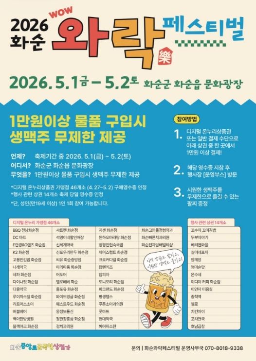 한방통신사 신다은기자 기자 | 화순군은 오는 5월 1일부터 2일까지 이틀간 화순읍 광덕문화광장 일원에서 ‘2026 화순 와락 페스티벌’을 개최한다고 밝혔다.