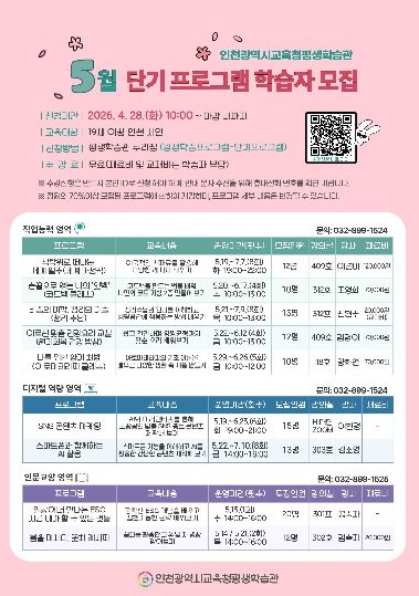 한방통신사 신유철기자 기자 | 인천광역시교육청평생학습관은 인천 시민에게 다양한 배움의 기회를 제공하기 위해 오는 28일부터 ‘5월 단기 평생교육 프로그램’ 학습자를 모집한다.