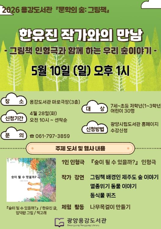 참여 신청은 4월 28일 오전 10시부터 광양시립도서관 누리집에서 선착순으로 진행되며, 모집 대상은 7세부터 초등학교 3학년까지 어린이 30명이다.