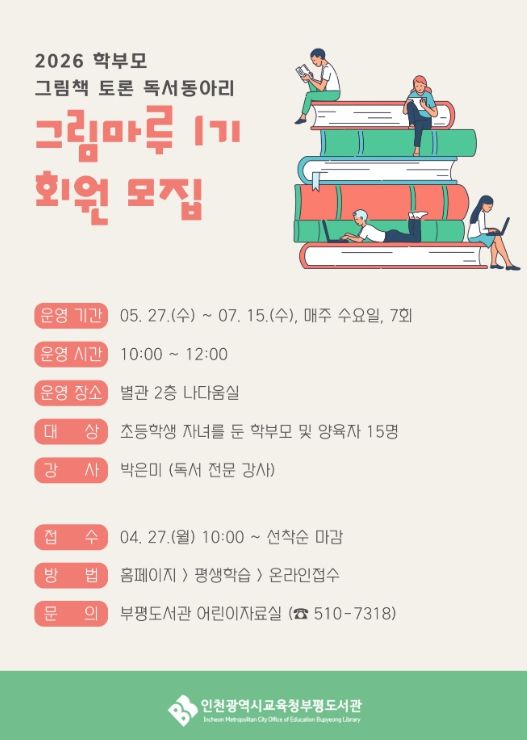 한방통신사 신유철기자 기자 | 인천광역시교육청부평도서관은 학부모의 독서 역량을 강화하고 자녀와의 소통을 돕기 위해 2026년 상반기 학부모 독서동아리 ‘그림마루 1기’ 참여자를 모집한다.