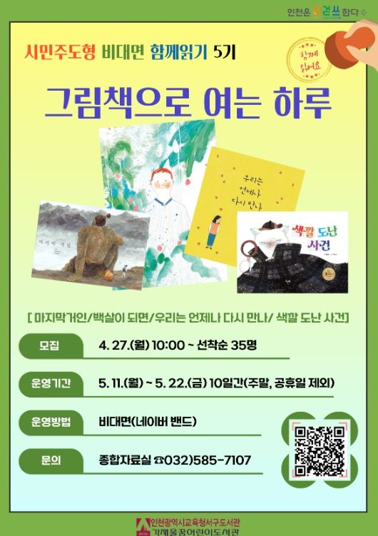 한방통신사 신유철기자 기자 | 인천광역시교육청서구도서관(관장 정연순)은 2026년 시민주도형 비대면 함께읽기 5기로, 5월 11일부터 5월 22일까지 ‘그림책으로 여는 하루’ 프로그램을 운영한다.