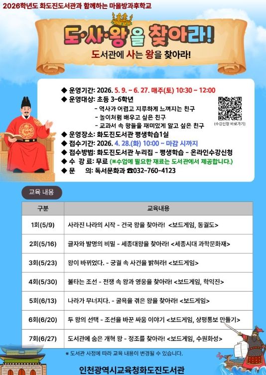한방통신사 신유철기자 기자 | 인천광역시교육청화도진도서관은 5월 9일부터 6월 27일까지 매주 토요일, 초등 3~6학년을 대상으로 역사 프로그램‘도서관에서 사는 왕을 찾아라!’를 운영한다.