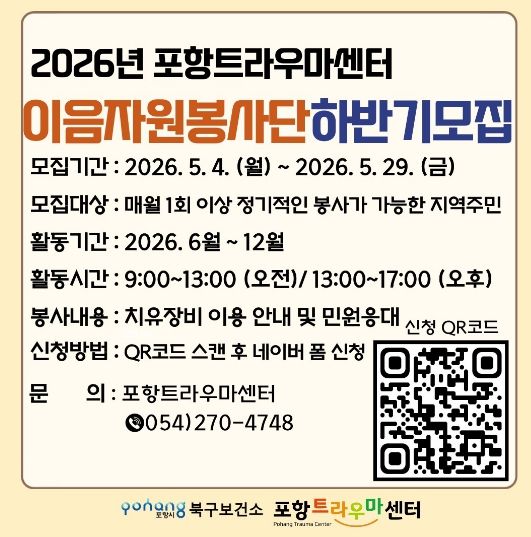 한방통신사 신유철기자 기자 | 포항시 북구보건소 트라우마센터는 지역사회 재난 및 일상 속 심리적 어려움을 겪는 시민들의 회복을 지원하기 위해 2026년 하반기 ‘이음 자원봉사단’을 추가 모집한다.