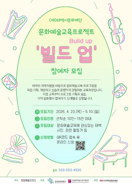한방통신사 양호선기자 기자 | (재)태백시문화재단은 지역 문화예술교육 인력 양성과 지속 가능한 문화예술 생태계 조성을 위해 '2026 태백 문화예술교육 프로젝트 ‘빌드 업(Build up)’' 참여자를 모집한다.