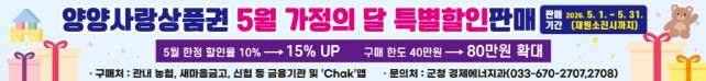한방통신사 양호선기자 기자 | 양양군이 5월 가정의 달을 맞아 군민들의 경제적 부담을 덜고 침체된 지역 상권을 살리기 위해 양양사랑상품권 특별 할인 판매를 실시한다고 밝혔다.
