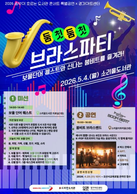 한방통신사 신유철기자 기자 | 오산시 소리울도서관은 제104회 어린이날을 앞둔 오는 5월 4일 경기아트센터와 협업해 ‘2026 음악이 흐르는 도서관 콘서트’ 특별공연인 ‘둠칫둠칫 브라스 파티’를 개최한다고 밝혔다.
