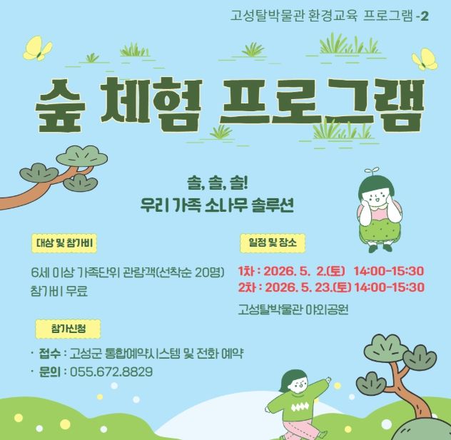 한방통신사 신유철기자 기자 | 고성탈박물관은 오는 5월 2일과 23일 오후 2시부터 가족 관람객 20명을 대상으로 숲 체험 프로그램을 운영한다.