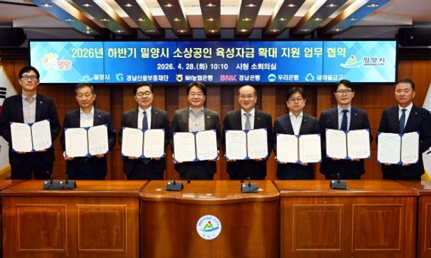 한방통신사 신유철기자 기자 | 경남 밀양시는 28일 시청 소회의실에서 경남신용보증재단, NH농협은행, BNK경남은행, 우리은행, MG새마을금고와 2026년 하반기 소상공인 육성자금 지원을 위한 업무협약을 체결했다.