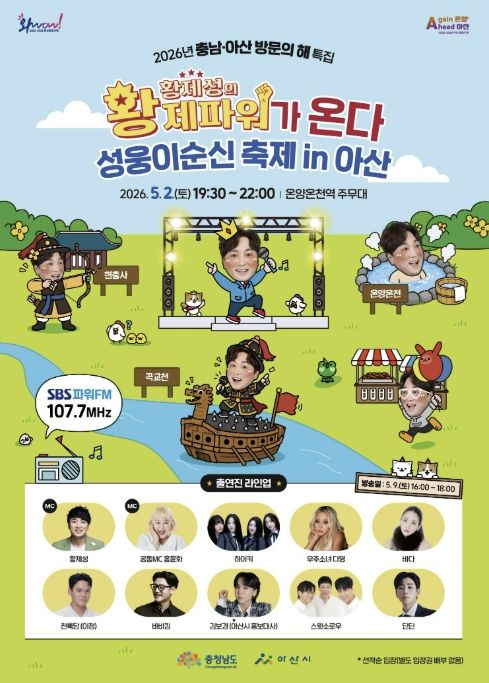 한방통신사 신태공 기자 | 인기 라디오 프로그램 SBS 파워FM ‘황제성의 황제파워’ 공개방송이 5월 2일 ‘제65회 아산 성웅 이순신축제’ 현장에서 열린다. 아산에서 라디오 공개방송이 열리는 것은 2013년 ‘대한민국 아산 온천대축제’ 이후 13년 만이다.