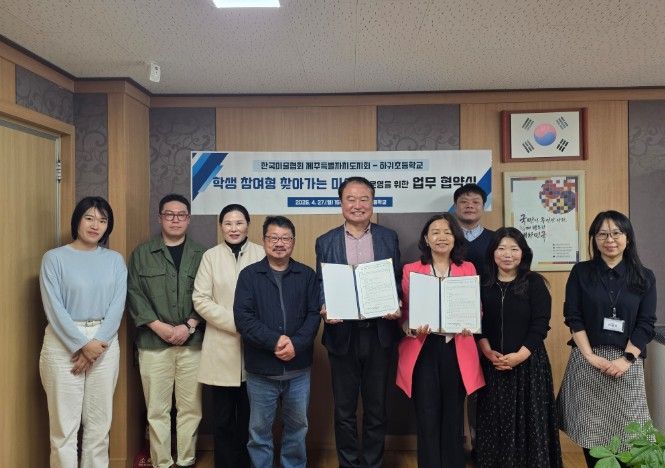 한방통신사 신유철기자 기자 | 제주도교육청 하귀초등학교는 27일 한국미술협회 제주특별자치도지회와 ‘학생 참여형 찾아가는 미술관’ 운영을 위한 업무협약(MOU)을 체결했다.