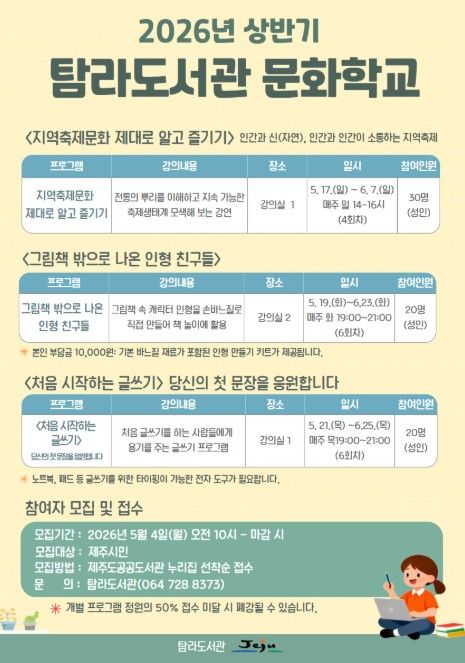 한방통신사 신유철기자 기자 | 제주시 라도서관은 시민들의 문화 감수성 함양과 문화 향유 기회 확대를 위해 2026년 상반기 ‘탐라도서관 문화학교’ 참여자를 5월 4일부터 모집한다.