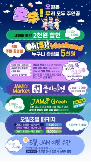 이외에도 보다 많은 관람객이 부담 없이 방문할 수 있도록 5월 주말 및 공휴일에는 관람료 5천원 이벤트도 진행되며 5월 3일부터 5월 5일까지 도내 중소상공인 판로지원을 위한‘JAM이 Market’도 운영된다. 자세한 내용은 제주항공우주박물관 홈페이지에서확인할 수 있다.