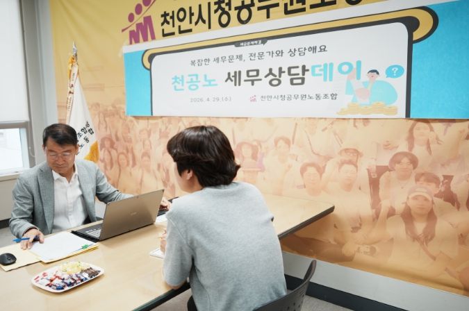 한방통신사 신태공 기자 | 천안시청공무원노동조합은 4월 29일 노동조합 사무실에서 조합원들의 세무 관련 고충 해소와 재산권 보호를 위한 '조합원 맞춤형 세무상담데이'를 성황리에 개최했다고 밝혔다.