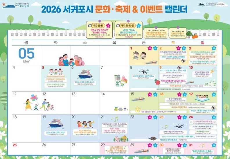 서귀포시는 5월 행사가 어린이날, 가정의 달, 도민체전, 읍면동 축제와 맞물려 있는 만큼 시민과 관광객이 주요 일정을 쉽게 확인할 수 있도록 행사 정보를 캘린더로 통합 안내할 예정으로, 방문 흐름이 원도심과 관광지, 읍면동 상권으로 이어질 수 있도록 할 방침이다.