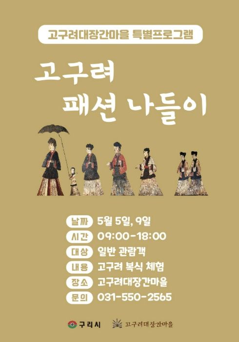 한방통신사 신유철기자 기자 | 구리시는 오는 5월 5일과 5월 9일 고구려대장간마을에서 특별 프로그램 ‘고구려 패션 나들이’를 운영한다고 밝혔다.