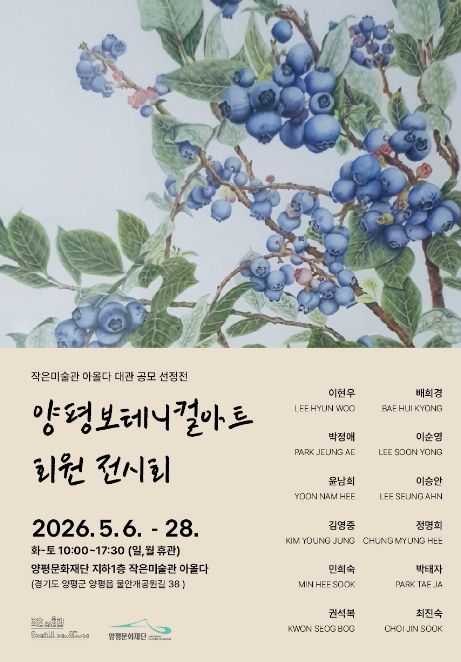한방통신사 신유철기자 기자 | (재)양평문화재단이 운영하는 작은미술관 아올다는 ‘양평보테니컬아트 회원전’을 개최한다. 이번 전시는 작은미술관 아올다 기획 대관 공모 선정 전시로, 5월 6일부터 5월 28일까지 진행된다.