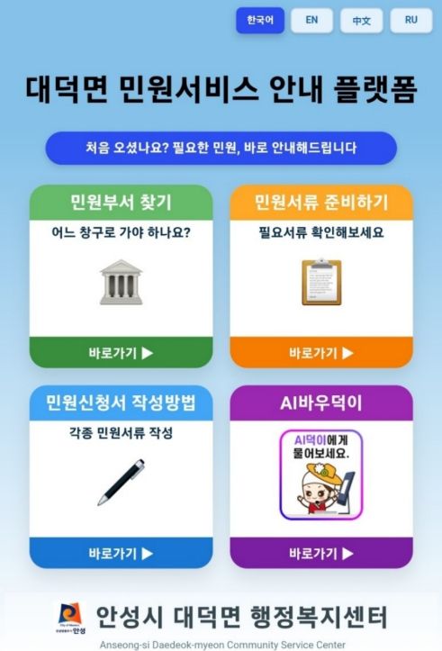 새롭게 구축된 ‘디지털 민원안내 플랫폼’은 행정복지센터 내에 비치된 태블릿PC를 통해 운영되며, ▲행정복지센터 내부 구조를 시각화한 민원부서 찾기 ▲상황별 구비서류 및 수수료 안내 ▲복잡한 서식을 화면으로 확대해 보여주는 서식 작성 가이드 ▲안성시 AI 챗봇 ‘바우덕이’와 연동한 스마트 지원 기능 등을 제공한다.