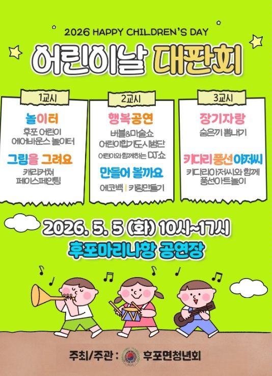 한편 후포 마리나항 공연장에서 열리는‘제8회 후포면 어린이날 대잔치’는 에어바운스 놀이터, 버블ㆍ마술쇼, 어린이합기도시범단, 어린이와 함께하는 DJ쇼, 장기자랑 등 다양한 공연과 체험 프로그램이 마련되어 어린이들에게 즐거운 추억을 선사한다.