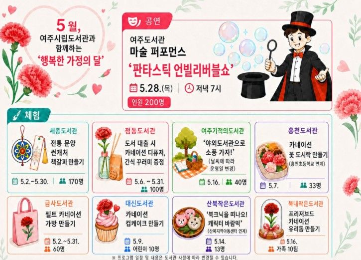 공연 프로그램으로는 여주도서관에서 마술 퍼포먼스 ‘판타스틱 언빌리버블쇼’가 오는 5월 28일 오후 7시에 개최된다. 이번 공연은 환상적인 마술과 흥미로운 연출을 통해 관람객에게 색다른 문화 경험을 제공할 것으로 기대된다. 체험 프로그램도 도서관별로 다양하게 마련하여 세종도서관에서는 ‘전통 문양 썬캐쳐 책갈피 만들기’를 5월 2일부터 30일까지 운영하며, 점동도서관에서는 도서 대출 이용자를 대상으로 카네이션 디퓨저와 간식 꾸러미를 제공하는 이벤트를 5월 6일부터 31일까지 진행한다.