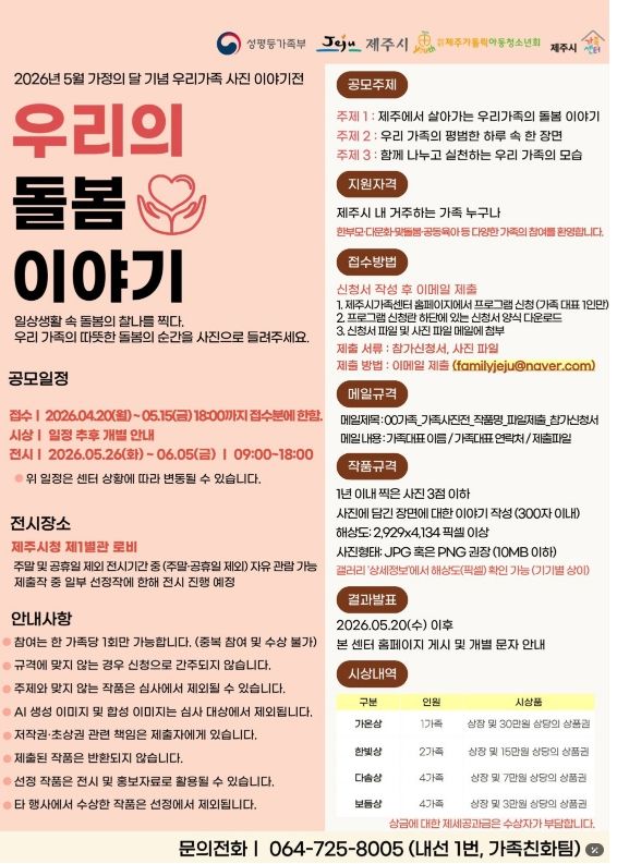 접수 기간은 5월 15일까지이며, 심사를 통해 선정된 11가족에게는 상장과 상품권이 수여된다. 선정작은 5월 26일부터 6월 5일까지 제주시청 제1별관 로비에 전시될 예정이다.
