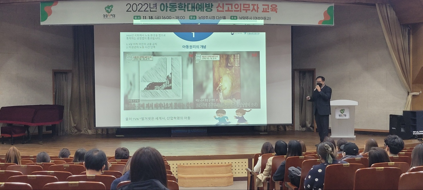 남양주시(시장 주광덕)는 지난 18일 시청 다산홀에서 지역 내 보육 시설 종사자 및 직원 60명을 대상으로 ‘아동 학대 예방 신고 의무자 교육’을 진행했다.
